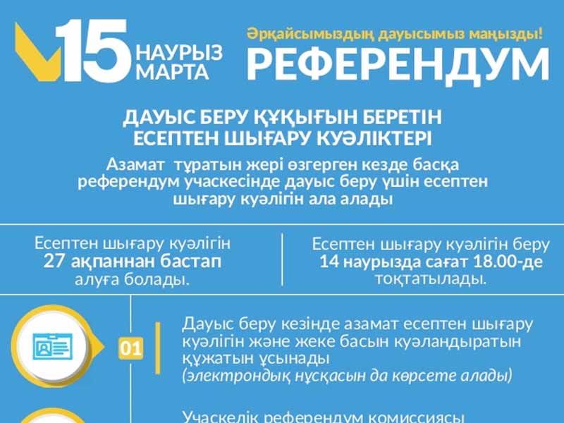 2026 жылғы 15 наурызға белгіленген жаңа Конституция жобасы бойынша республикалық референдумға байланысты есептен шығару куәліктерін алу тәртібі төмендегідей: берілетін мерзімі: 2026 жылғы 27 ақпаннан бастап 14 наурыз күні сағат 18:00-ге дейін (қоса алғанда).