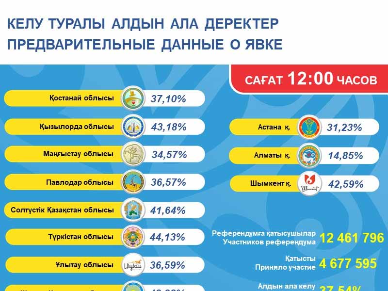 Орталық референдум комиссиясы хабарлайды: облыстардың, республикалық маңызы бар қалалардың және астананың аумақтық комиссиялары ұсынған деректерге сәйкес сағат 12.00–дегі жағдай бойынша өңірлерде азаматтардың келуі мынаны құрады: